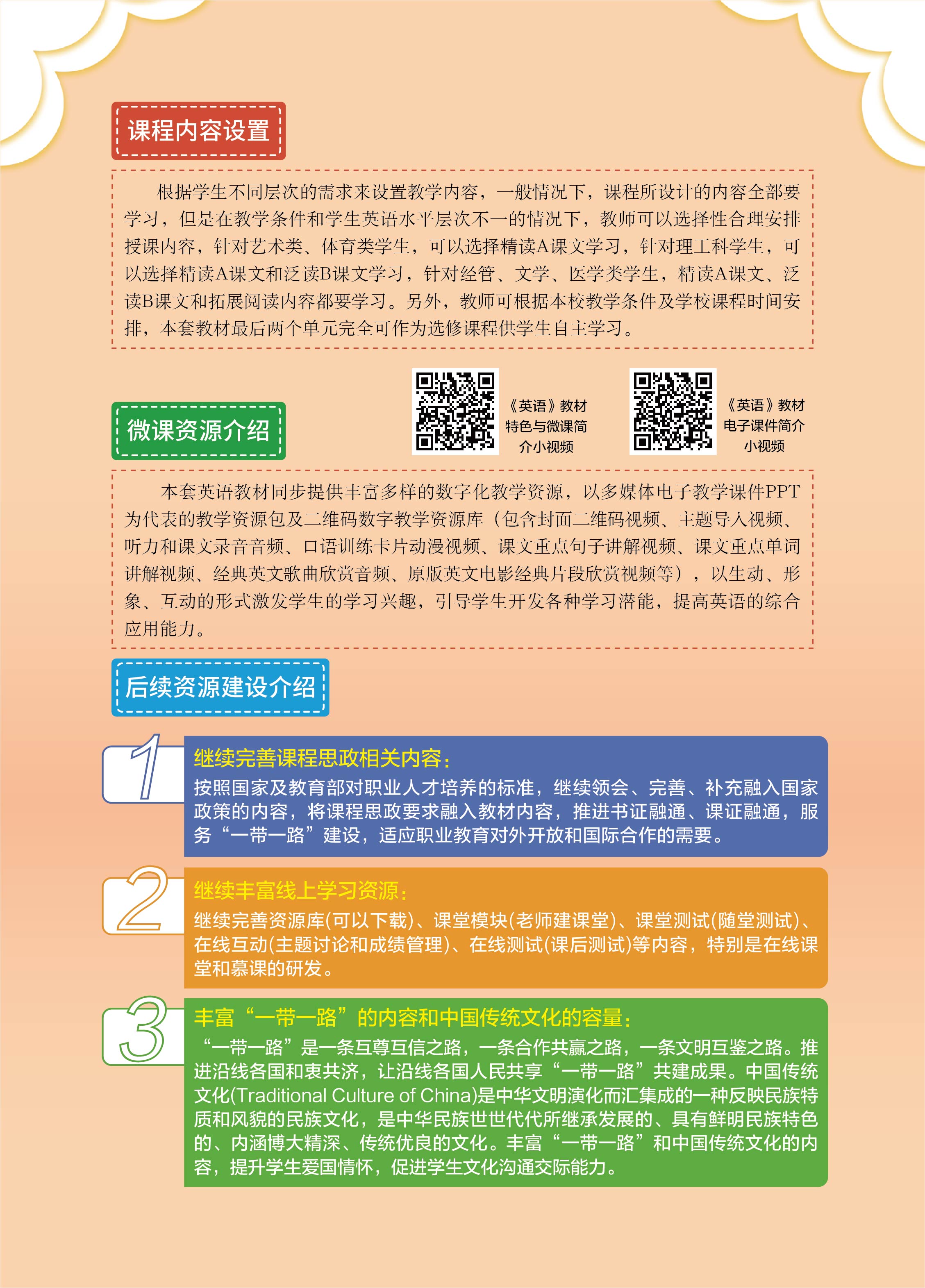 本系列教材共分两册,第一册包含Campus Life,Healthy Lifestyle,Surfing the Internet,Transportation and Tourism 四个主话题;第二册包含Career Planning and Development,E-commerce,Property Sales and Leasing,Dietary Culture 四个主话题。其中每册均含学生用书、综合实训、教师用书及配套的多媒体电子教学课件PPT和二维码数字教学资源库等。