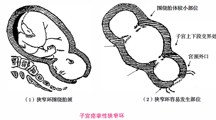 ②子宫痉挛性狭窄环:子宫局部肌肉强直性收缩,形成环状狭窄,缠绕胎体的某一部位,多发生在胎体的狭窄部位如胎颈、胎儿腰部等。痉挛性狭窄环可以发生在宫颈、子宫下段或子宫的任何部位,需与先兆子宫破裂的病理性缩复环鉴别。痉挛性狭窄环多由于产妇紧张、过度疲劳或不恰当地应用宫缩剂及粗暴的宫腔操作。