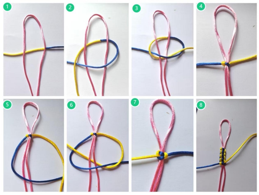 (3)将黄色线从粉红色线下方绕过,并从蓝色圈中穿出。
