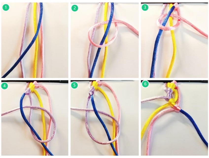 (5)用紫色线从上绕蓝色线再绕一圈拉紧后为一个左斜卷结,按同样的方式把黄色线和粉色线以蓝色线为轴做右斜卷结,见图⑤⑥。