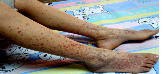 反复出现皮肤紫癜为过敏性紫癜的特征表现,常为首发症状,多见于四肢和臀部,伸侧较多,对称分布,分批出现,面部和躯干较少见。初起为鲜红色或紫红色斑丘疹,高出皮面,压之不褪色,此后颜色加深呈暗紫色,最后呈棕褐色而消退。