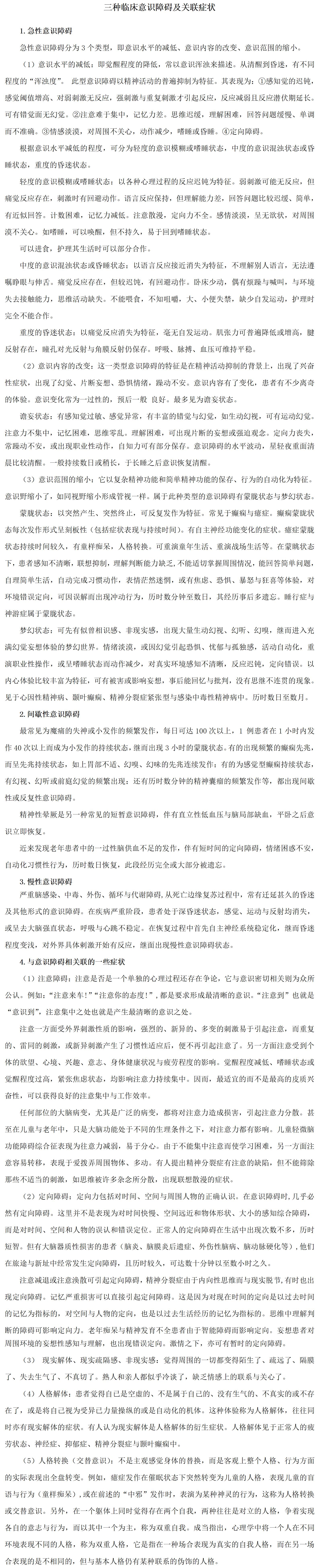 三种临床意识障碍及关联症状