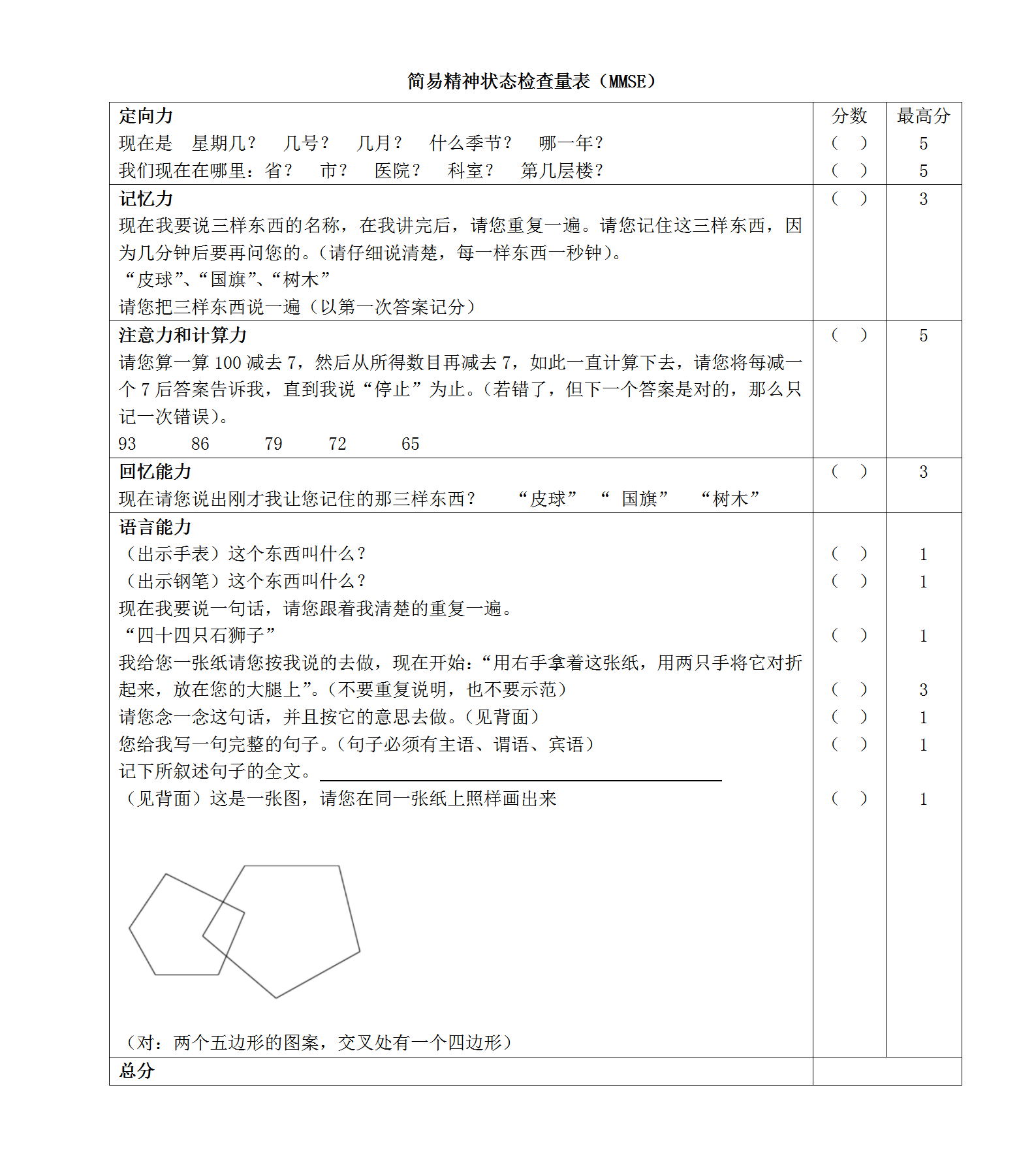 简易精神状态检查量表(MMSE)